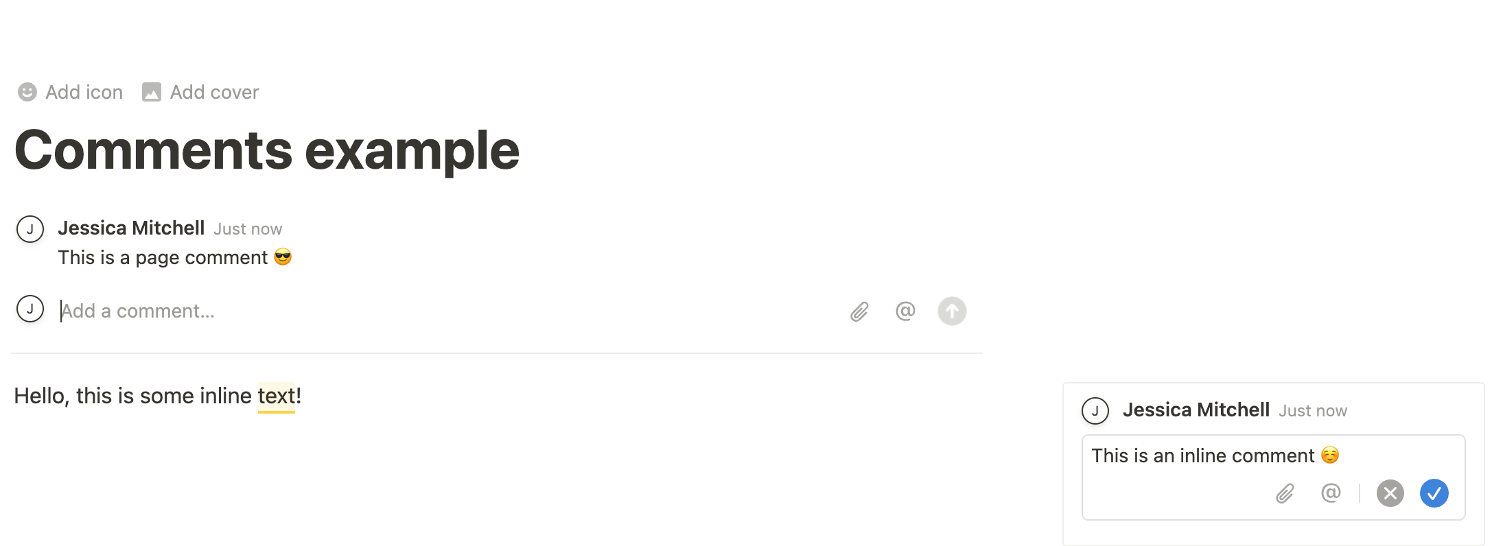 - Add an inline comment to child blocks on the page (i.e. comment on page content).