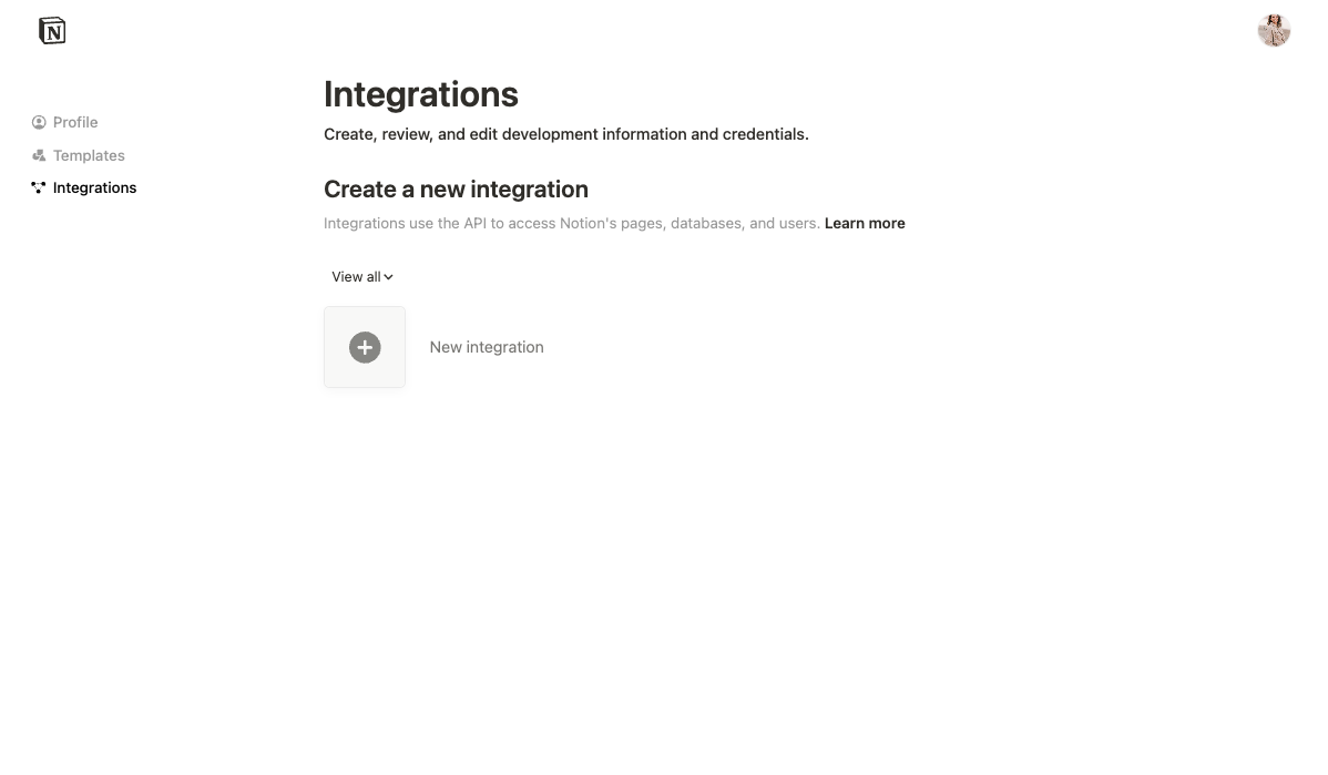 The first step to building any integration (internal or public) is to create a new integration in Notion’s integrations dashboard.1