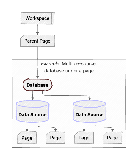 Here’s a diagram of a scenario where a workspace has a top-level page that has a database with two data sources: