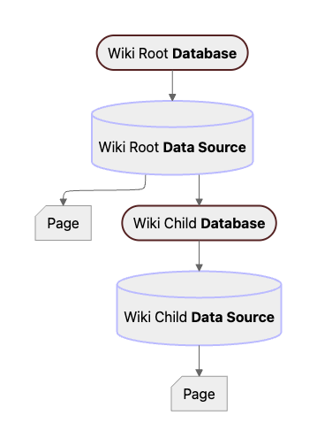 Unlike other databases, wikis won’t support multiple data sources as part of the September 2025 launch. For this reason, and due to limited support in Notion’s API, we recommend using alternative ways to structure your knowledge in Notion that don’t involve wikis.However, for completeness, here’s a diagram of how parent/child relationships work in an example wiki scenario: