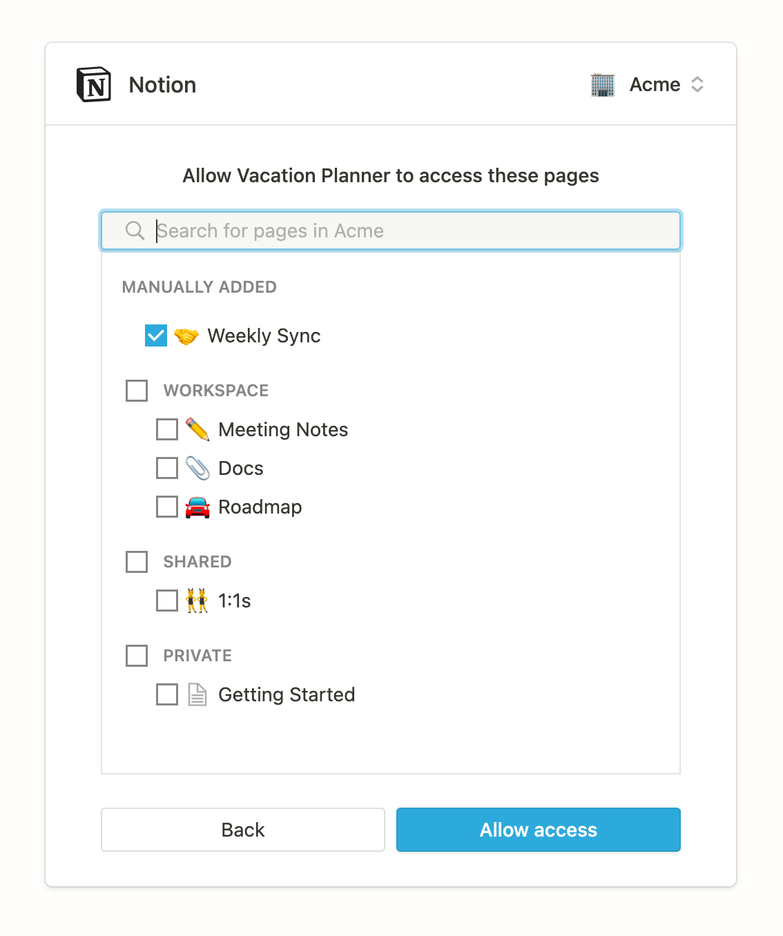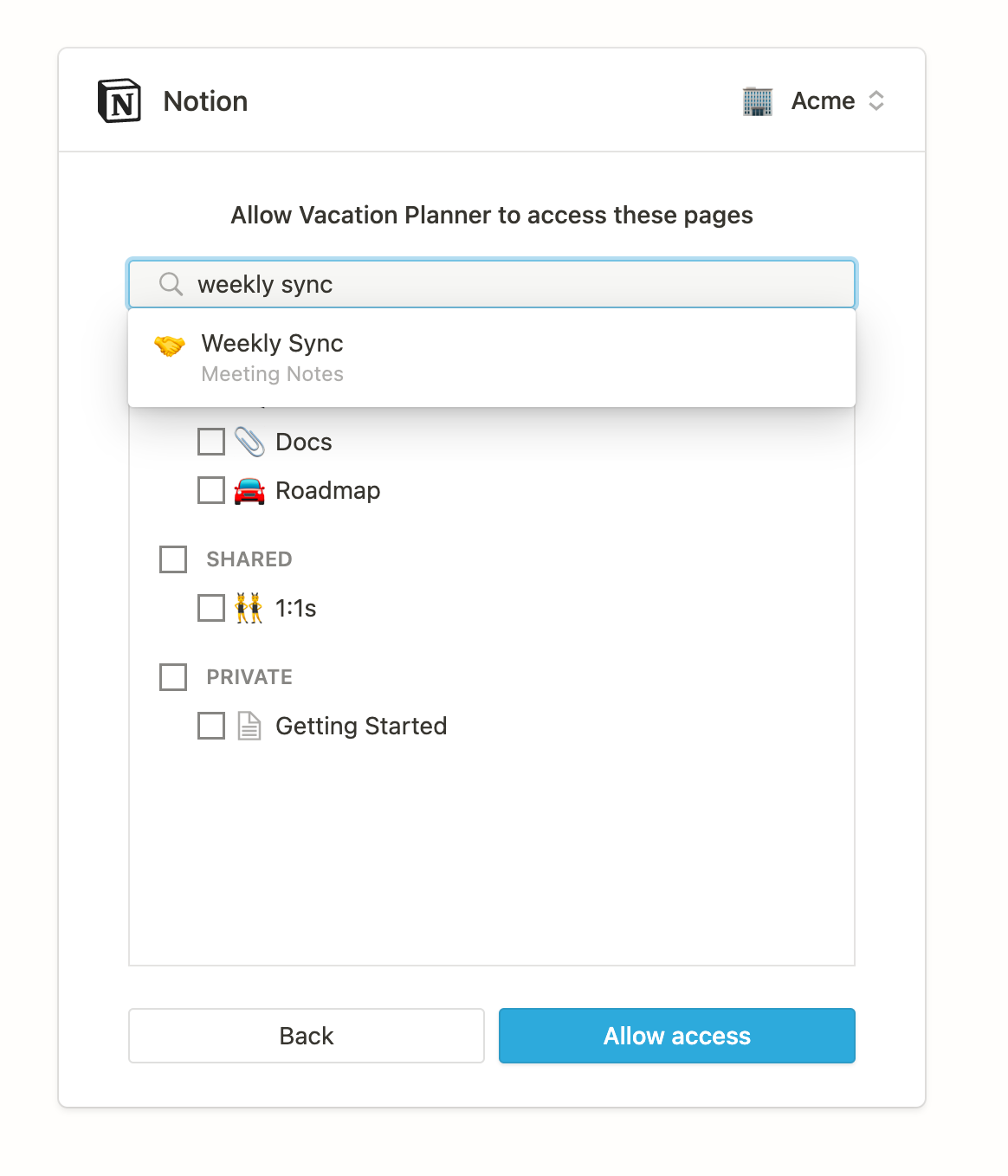 We’ve made improvements to the OAuth flow to make it easier to use.We now show the page picker on reauthorization. Just like before, the user who initially authorized an integration can reauthorize by going through OAuth a second time. The page picker step will remember which pages have already been shared with the integration, if any, and let users share or un-share additional pages.Users can search for pages to share with an integration. Previously, users could only select pages at the top level of the Workspace, Shared section, or Private pages section to share with an integration, but we’ve added a search bar so users can search for and select any page in their workspace.We also updated the page picker to only show pages for which the user has Full Access permission. Previously, the page picker show any pages for which the user had at least Can View permission, but would show an error when they tried to give the permission access to those pages.Other OAuth behavior has not changed: only admins can go through OAuth, and only the original person originally added an integration via OAuth can go through the flow again.