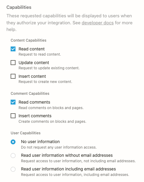 An integration can request different levels of user capabilities, which affect how user objects are returned from the Notion API:- No user information: Selecting this option prevents an integration from requesting any information about users. User objects will not include any information about the user, including name, profile image, or their email address.