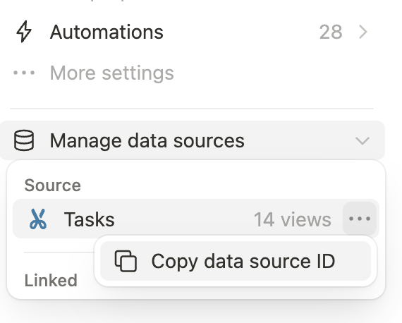 To get a data source ID from the Notion app directly, the settings menu for a database includes a “Copy data source ID” button under “Manage data sources”: