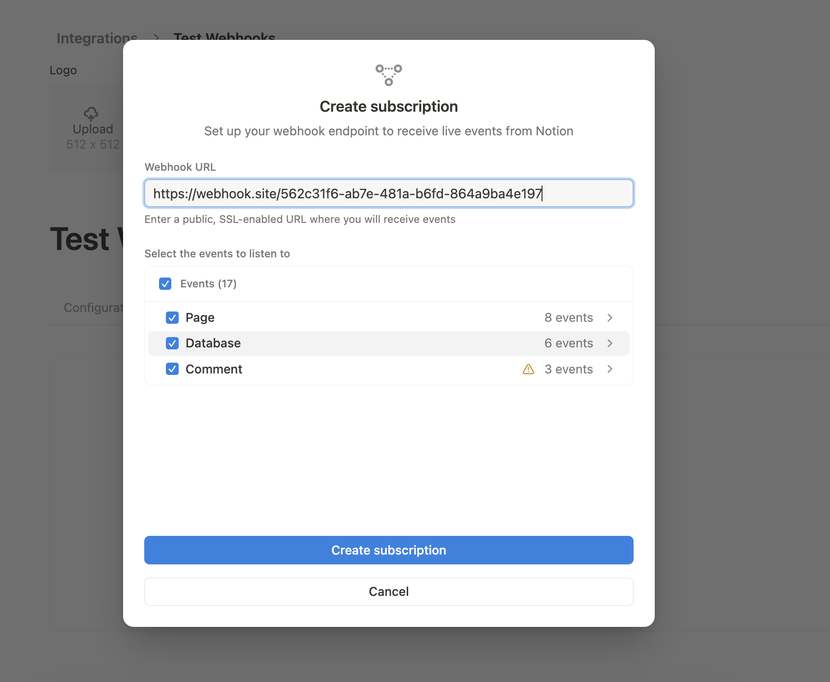 Enter your public Webhook URL — this is the public endpoint where you want Notion to send events. It must be a secure (SSL) and publicly available endpoint. Endpoints in localhost are not reachable.