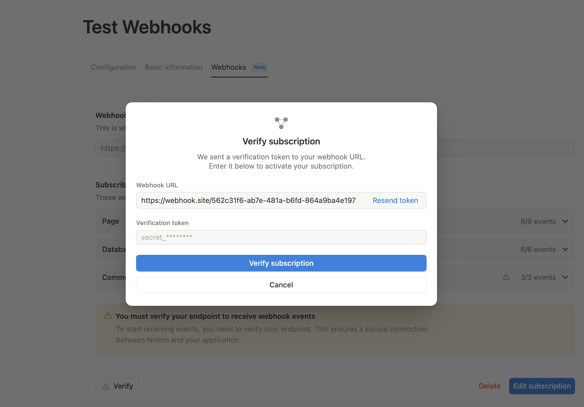 When you create a subscription, Notion sends a one-time POST request to your webhook URL. The body of the request contains averification_token, which proves that Notion can successfully reach your endpoint.